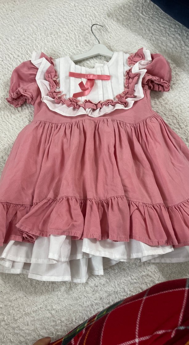 Pembe pastel renkli, sentetik kumaştan, kısa kollu, fırfırlı ve yakalı, salaş kesim kız çocuk elbisesi. Katmanlı etek ve küçük fiyonk detayı bulunur.