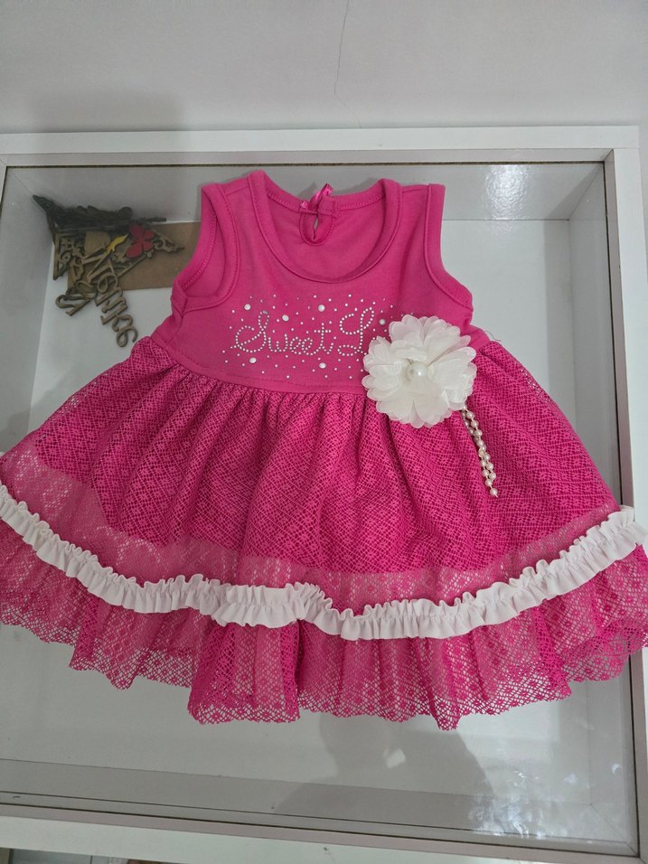 Kolsuz, pembe kız çocuk elbisesi, işlemeli detayları ve renkli fırfırlı etek kısmıyla beyaz çiçek süsü içerir.