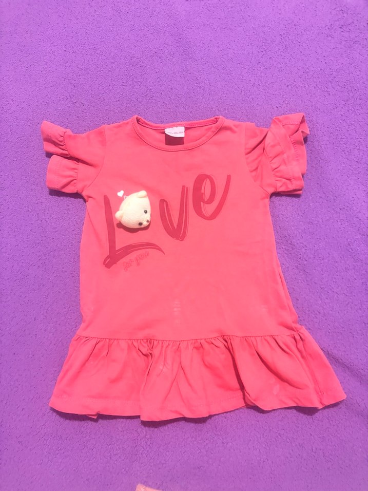 Yumuşak polar kumaştan pembe kız çocuk elbise, kısa fırfırlı kollu ve bol kesimlidir. Yuvarlak yaka ve renkli baskılı "Love" yazısı ile küçük peluş ayıcık detayı vardır. Ürünü aldığımda hamileydim yıkayıp kaldırmıştım hiç giyilmedi hurçta kalmış artık olmadığı için satıyorum temizdir gönül rahatlığıyla alabilirsiniz üründe iade yoktur.