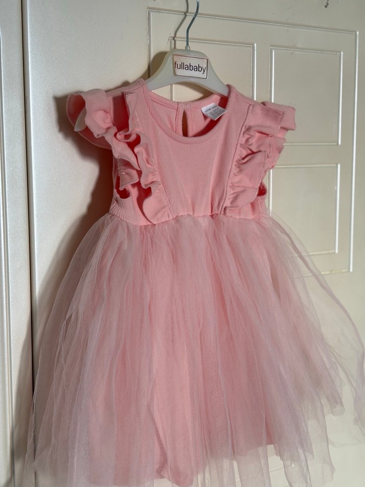 Pembe renkli, fırfırlı kolsuz omuz detayları ve yumuşak tül etekli, straplez görünümlü klasik kesim elbise. LCW markalı. Bir defa giyildi tertemiz