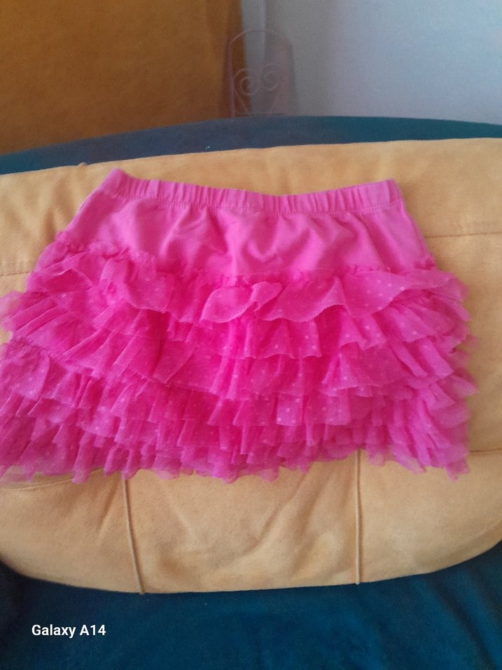 Pembe renkli, vücuda oturan, yumuşak sentetik kumaştan yapılmış çok katlı fırfırlı kız çocuk eteği.