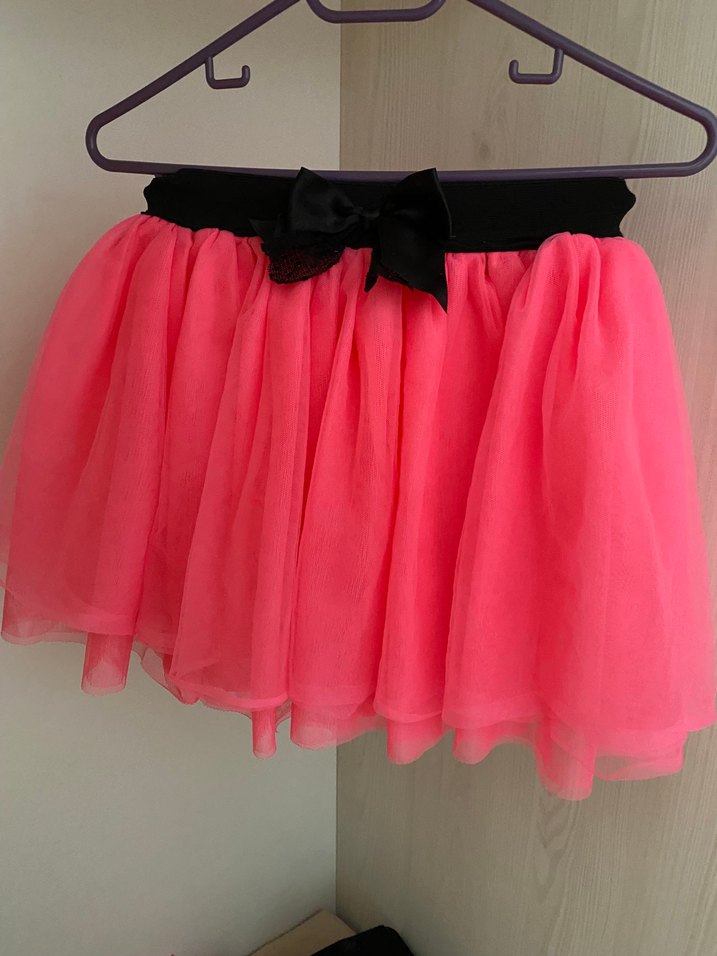 Pembe renkli, sıkı oturan kız çocuk eteği, renkli sentetik kumaş ve belinde siyah fiyonk ile gotik ve şık tarzı birleştirir.