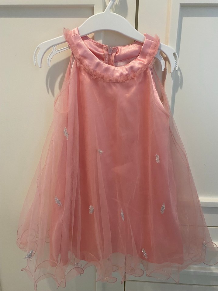 Pastel pembemsi renkli kız çocuk elbisesi, nakışlı desenlere sahip bol kesimdir. Straplez yaka ve fırfır detayları bulunur. Yumuşak dokulu saten kumaştan, kolsuz ve bohem tarzda.
