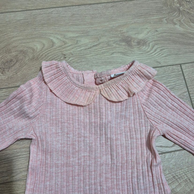 Pembe renkli, triko kumaştan yapılmış, fırfırlı yakalı ve uzun kollu, vücuda oturan kız çocuk bluzu.