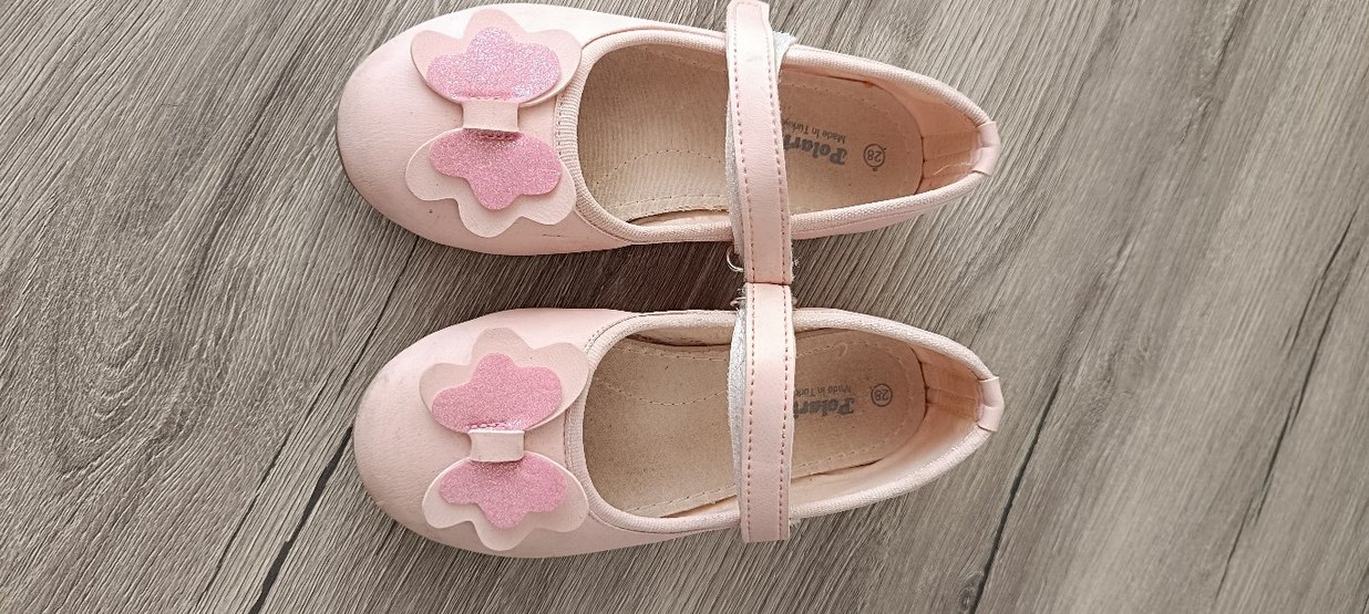Pembe tonlarında, kalp desenli ve fiyonklu kız çocuk babeti, rahat tokalı tasarımla sunuluyor.