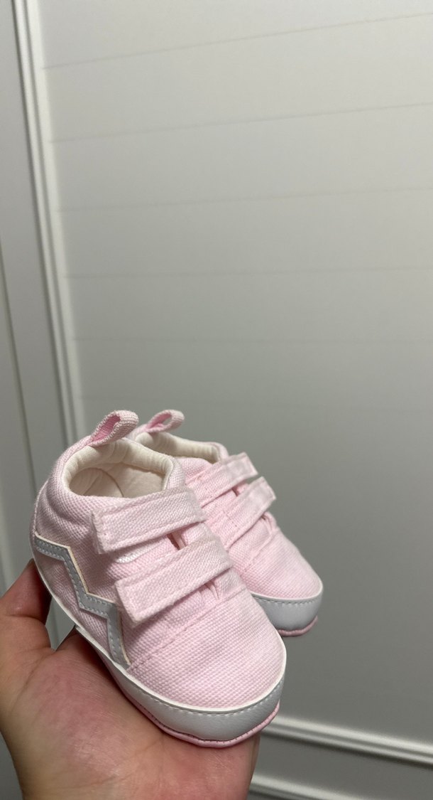 Pembe renkli, kız çocukları için ilk adım ayakkabısı. Velcro bantlı, yumuşak kauçuk tabanlı, pastel ve desensiz sokak tarzı ayakkabı.