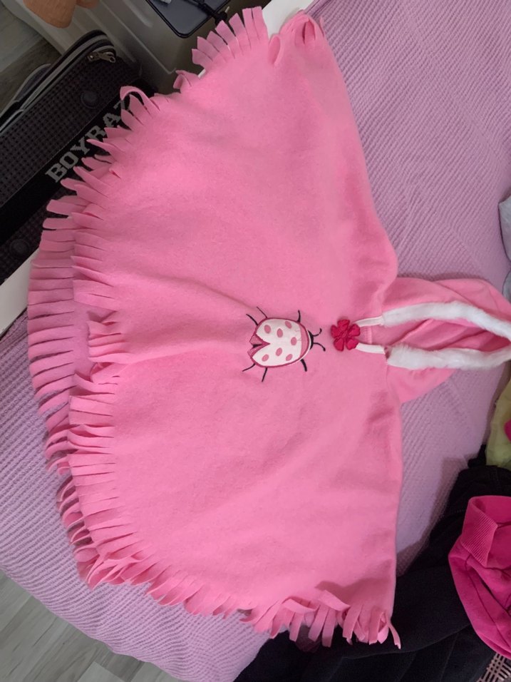 Pembe kapüşonlu, kolsuz kız çocuk pelerini, nakışlı ve fırfırlı detaylara sahip. Bohem tarzda, yumuşak ve sıcak kumaştan üretilmiştir.