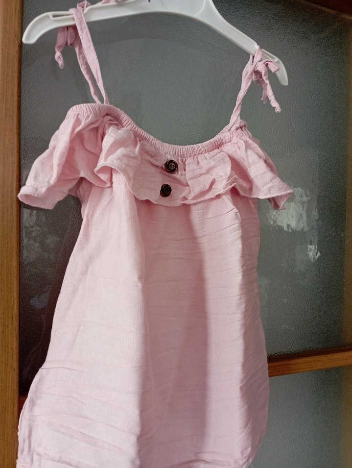 Yumuşak keten kumaştan, askılı ve kolsuz pembe kız çocuk şort lu . Straplez yakada fırfır ve düğme detayları bulunur, pastel bohem tarzda.