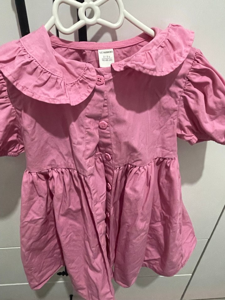 Pembe keten kumaştan yapılmış, kısa kollu ve yakasında fırfır detaylı bol kesim kız çocuk elbisesi. Desensiz ve normcore tarzda.