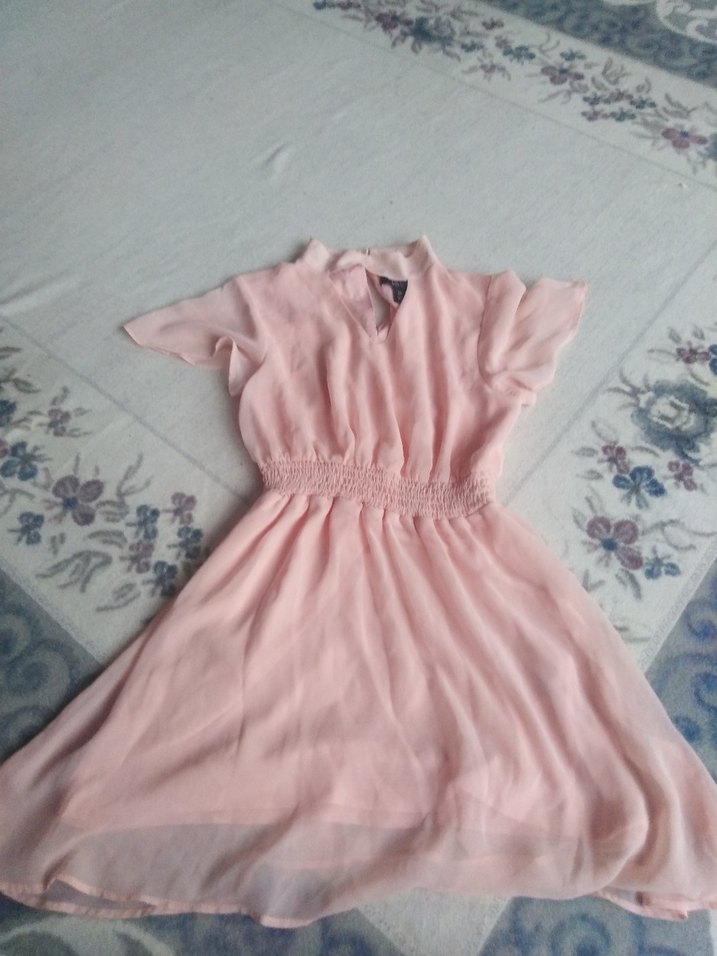 Pembe keten kumaştan, kısa kollu, V yakalı ve fırfır detaylı, bol kesim kız çocuk elbisesi. Bel kısmı büzgülü, rahat ve şık bir tasarım sunar.