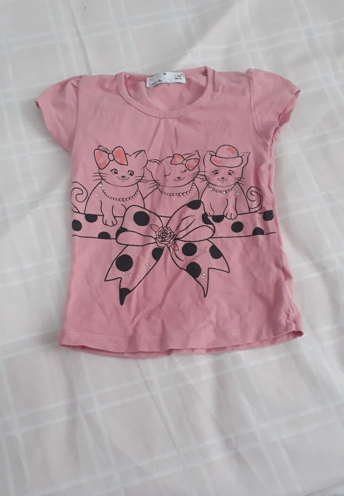Kısa kollu, bisiklet yaka, pembe renkli, baskılı ve fiyonk detaylı kız çocuk tişörtü, sentetik kumaştan üretilmiştir.
