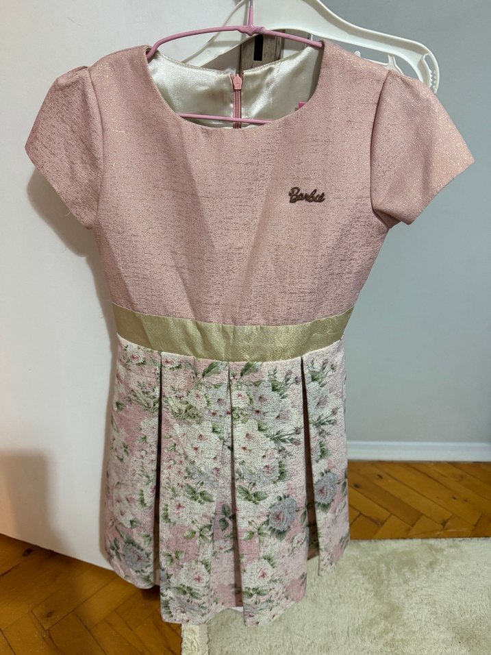 Kısa kollu, pembe renkli kız çocuk elbisesi, çiçek desenli pilili etek ve parlak kemer detayına sahiptir.