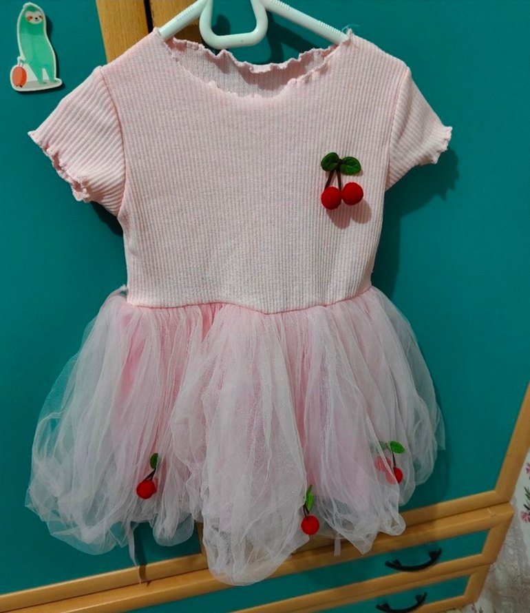 Pembe, kısa kollu, yakası bisiklet yaka kız çocuk elbisesi. Fırfırlı detaylar ve işlemeli kiraz desenleri bulunur.