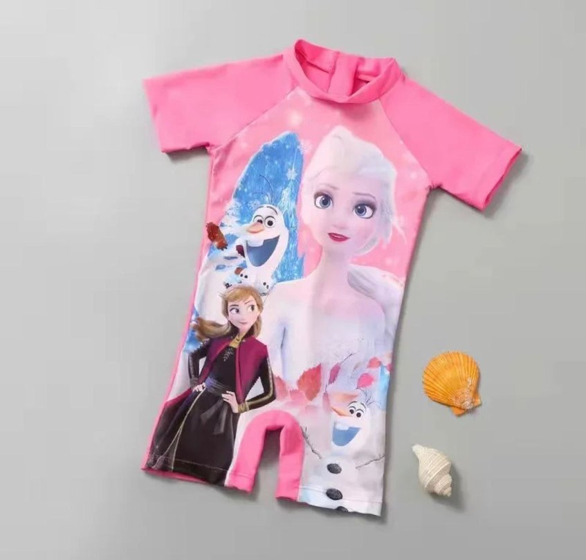 Pembe renkli, kısa kollu kız çocuk mayosu, popüler Frozen karakterleri baskılı, plaj için uygun.6-7 ️7-8 9-10 yaş mevcut.