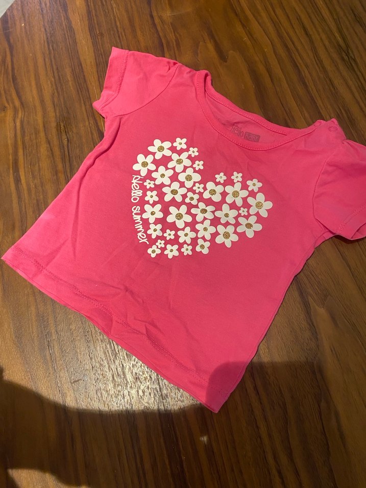 Pembe renkte, kısa kollu, yuvarlak yaka pamuklu kız çocuk tişörtü. Önünde payet işlemeli çiçekli kalp ve 'Hello Summer' yazısı bulunur.