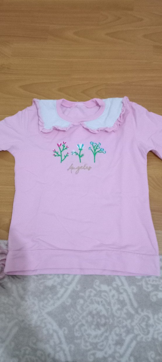 Pastel pembe kız çocuk tişört fırfırlı yakaya sahiptir. Pamuklu kumaştan, rahat ve bol kesimdir. Çiçek desenlidir.