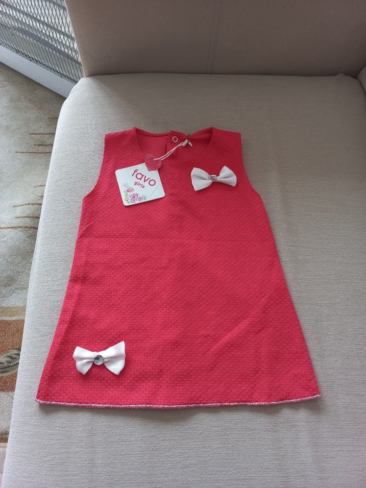 Pembe renkli, kolsuz, bol kesim kız çocuk elbisesi, yumuşak ve sıcak kumaştan üretilmiştir. Üzerinde renkli baskı ve iki beyaz fiyonk detayları bulunur. 2 yaş