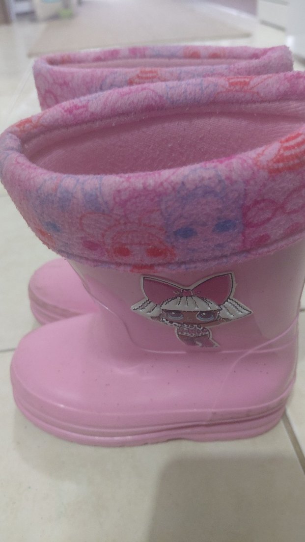 Pembe kız çocuk çizmesi, lastik malzemeden üretilmiş ve fırfır detayına sahip. Renkli iç astarı ve sevimli karakter baskısı bulunuyor.