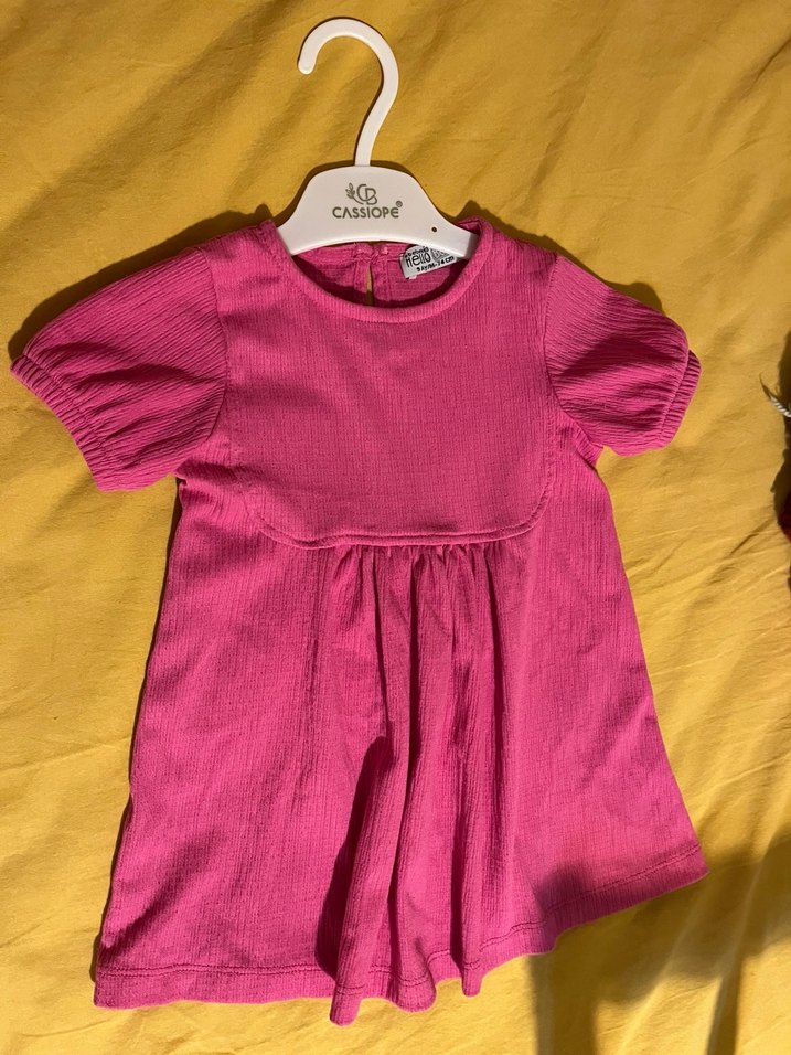 Pembe renkli kız çocuk elbisesi, keten kumaştan, kısa kollu, bol kesim ve pileli tasarıma sahiptir. Yuvarlak yaka ve sade, bohem tarzındadır. 9/12 ay e bebek temiz defosuz ve lekesizdir az kullanılmıştır
