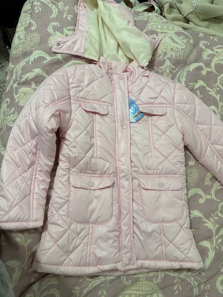 Pastel pembe, düğmeli, yumuşak, sıcak kumaştan yapılmış kız montu. Sokak tarzı için uygun.
