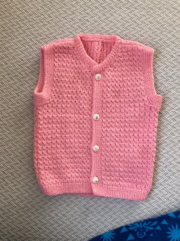 Pastel pembe renkli, kolsuz, düğmeli kız çocuk örgü yelek. Rahat kesimli, yumuşak örgü kumaştan üretilmiştir.