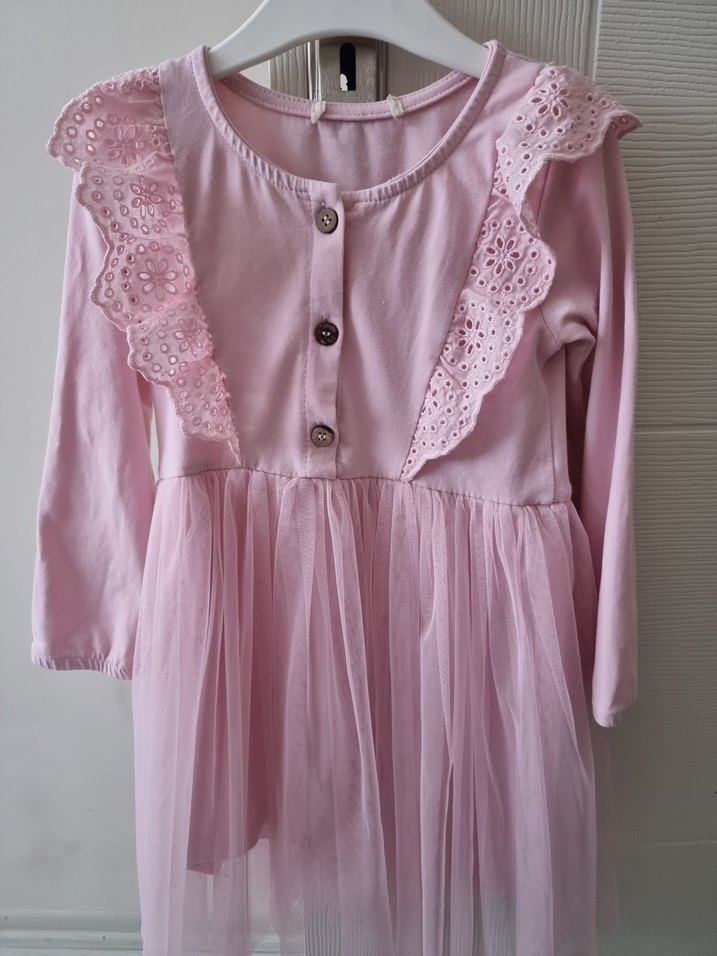 Pastel pembe kız çocuk elbise, uzun kollu ve V yakalıdır. Nakışlı fırfırlar ve tül etek detayıyla pamuklu, bol kesimdir.