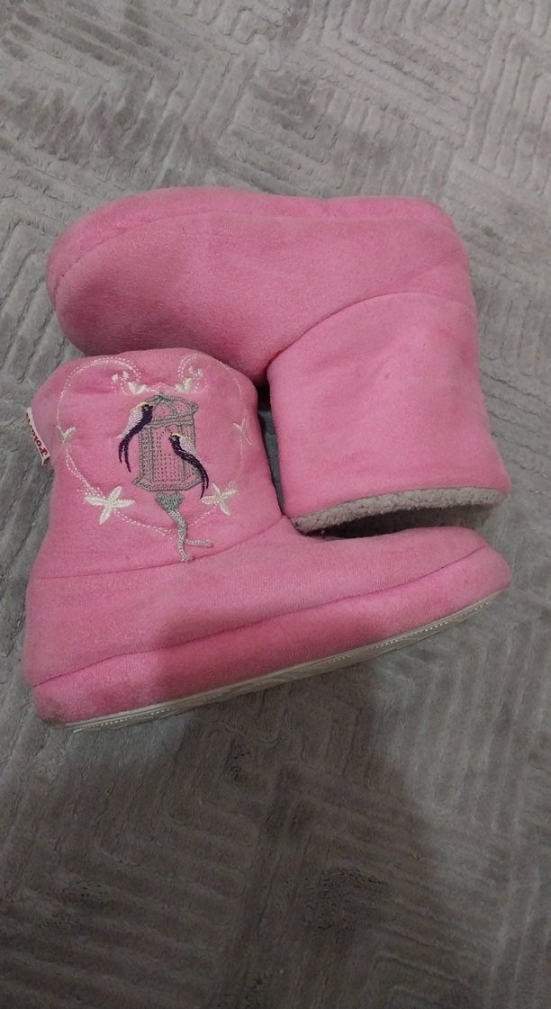 Pembe renkli kız çocuk ev terlikleri, yumuşak tüylü detaylar ve nakışlı desenlerle rahatlık sağlar.