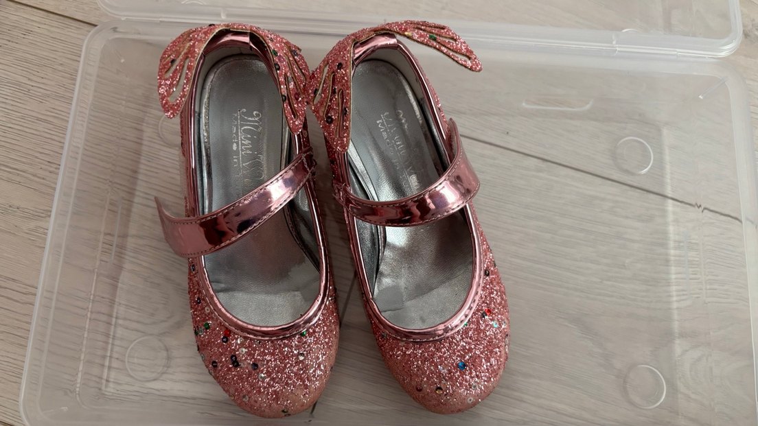 Pinknluekids marka Pembe, payetli kelebek detaylı ve renkli çiçek desenli kız çocuk topuklu sorunsuz yıpranmamış yepyeni rahat