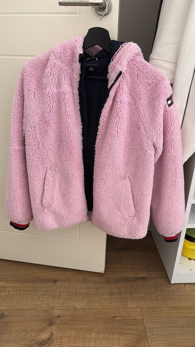 Pembe renkli, peluş detaylı, bol kesim ve uzun kollu ceket. Kapşonlu ve midi boyuyla rahat ve sade bir sokak stili sunar. Günlük kullanım için ideal, desensiz ve pastel tonlarda.