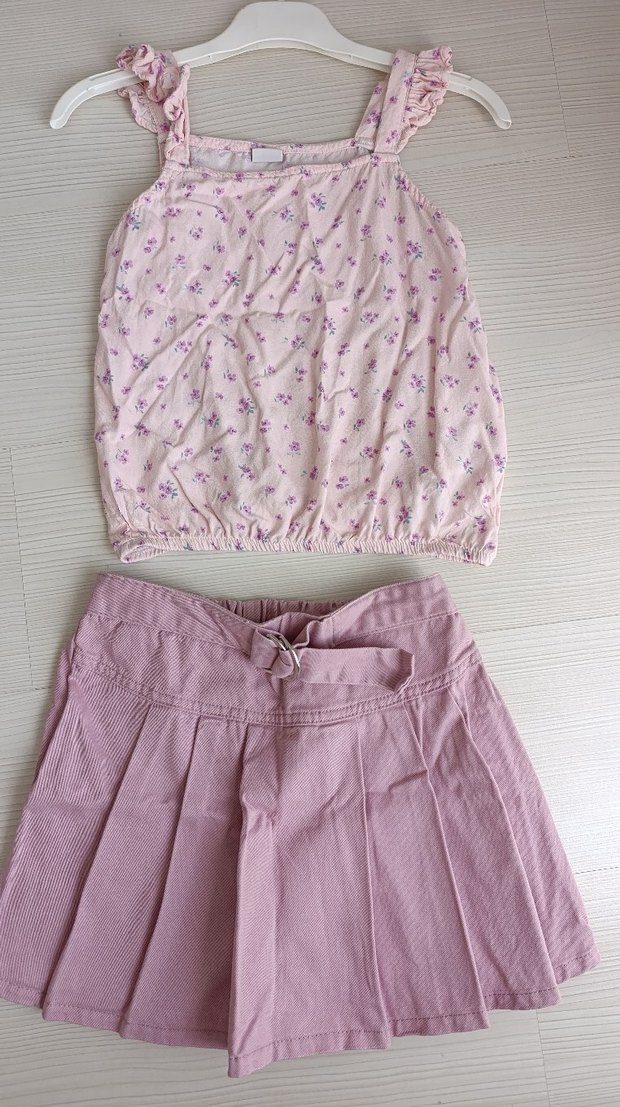 Pastel pembe, küçük çiçek desenli askılı üst ve piliseli, fiyonk detaylı etekten oluşan kız bebek takımı. Yumuşak ve rahat kumaş.