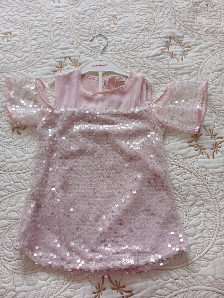 Pembe kız çocuk elbisesi, kısa kollu ve pul detaylıdır. straplez yakası ve bol kesimiyle bohem bir tarz sunar. (Kızıma doğum gününde hediye geldi. Etiketi yoktu. ön kısmında belli belirsiz bir leke var ama yıkanınca çıkar. )
