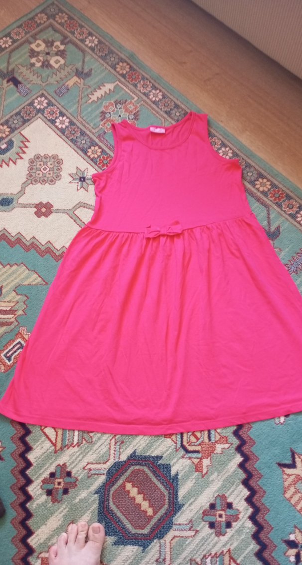 Pembe renkli, kolsuz, salaş kesim kız çocuk elbisesi, yumuşak penye kumaştan ve fırfır detaylıdır.