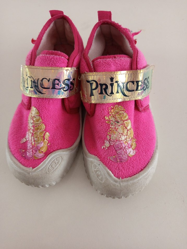 Renkli baskılı, yumuşak kürk kumaştan pembe kız çocuk terliği. Velcro bantlı ve 'Princess' baskılı, bohem ve retro tarzına uygun.