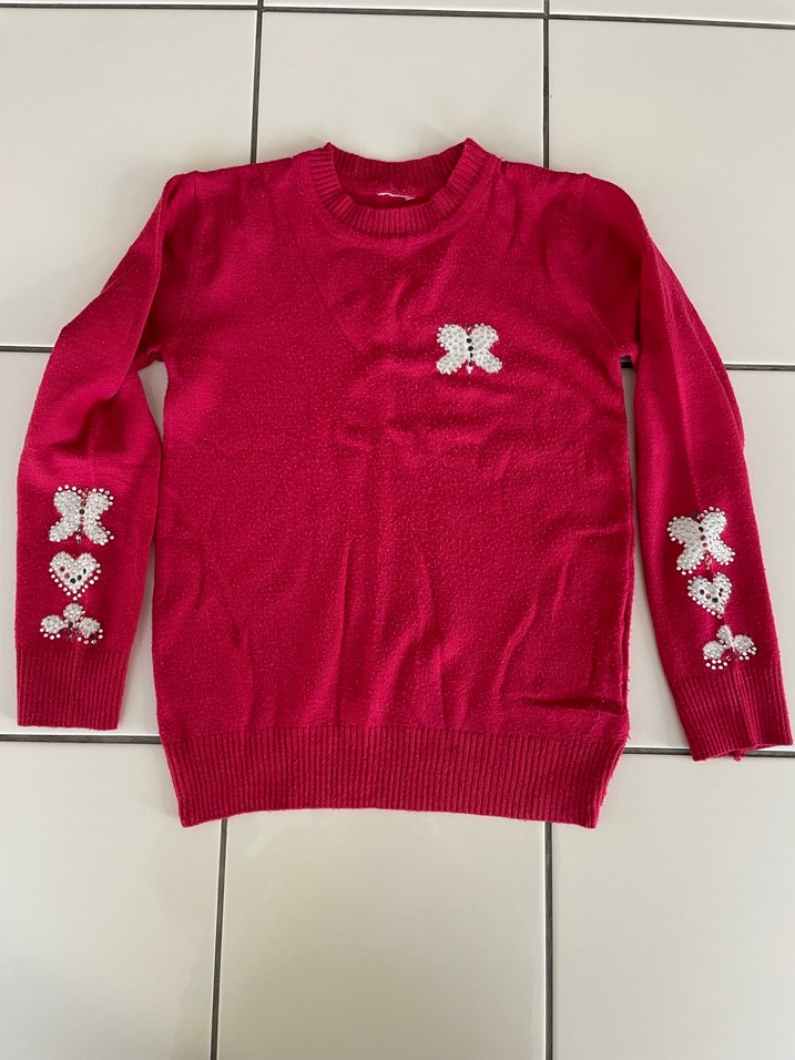 Pembe triko kazak, uzun kollu ve yuvarlak yakalıdır. Kollar ve göğüste renkli kelebek ve kalp desenleri bulunur. Rahat ve şık bir sokak stili sunar. Çok hafif tüylenme mevcut,görsellerini paylaştım.rengi fotoğrafta olduğu gibi çok koyu değil..
