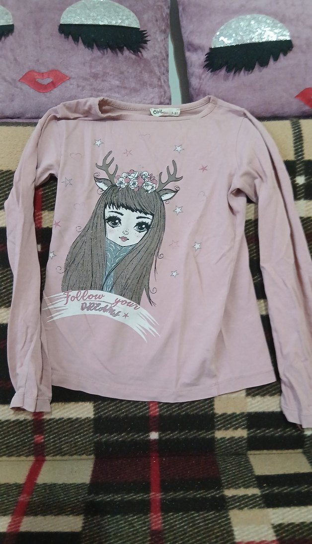 Pembe triko kumaştan, baskılı, kız çocukları için uzun kollu, fitted kesim tişört. Üzerinde boynuzlu kız ve yıldız desenleri ile 'follow your dreams' yazısı bulunur.