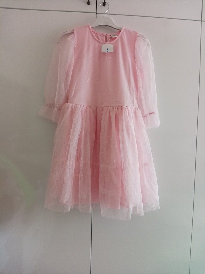 Pastel pembe renkte, uzun kollu ve fırfırlı detaylara sahip kız çocuk elbisesi. Rahat kesimli ve sentetik yumuşak kumaştan üretilmiştir.