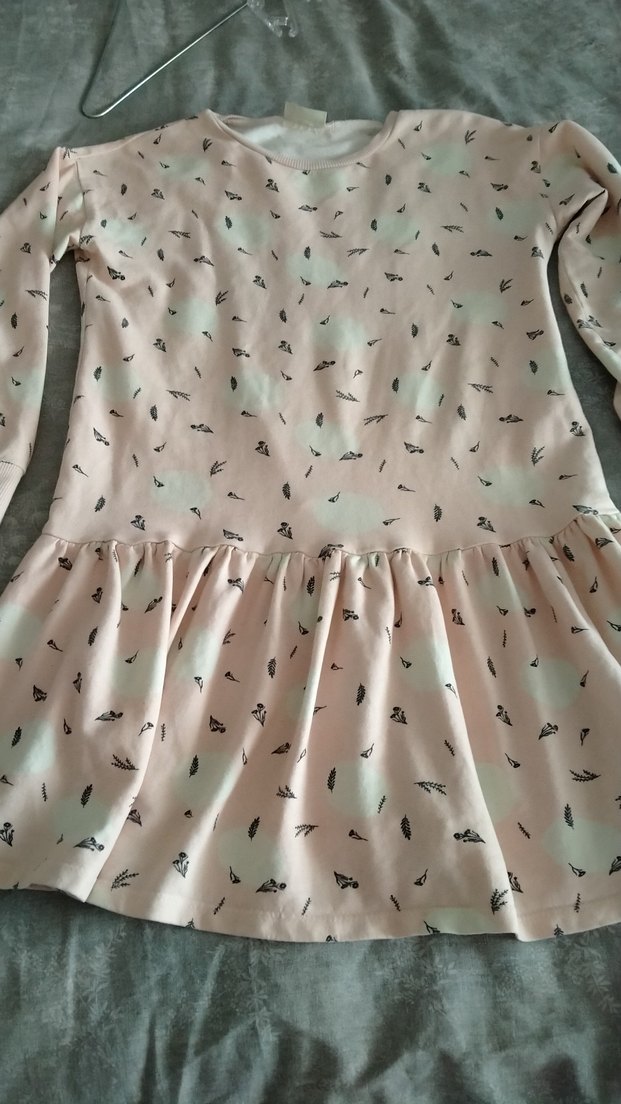 Pembe renkli, uzun kollu, yuvarlak yakalı kız çocuk elbisesi. Fırfır detayı ve ince desenlerle süslenmiş, rahat sentetik kumaştan yapılmıştır. Cok az kullanıldı. Daha yepyenı.
