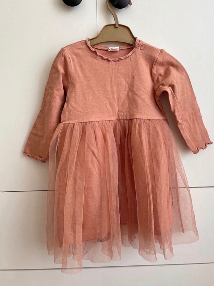 Pembe renk, uzun kollu, yuvarlak yakalı, fırfırlı detaylı, bol kesim kız çocuk elbisesi. Yumuşak sentetik kumaştan, katmanlı etek kısmıyla.