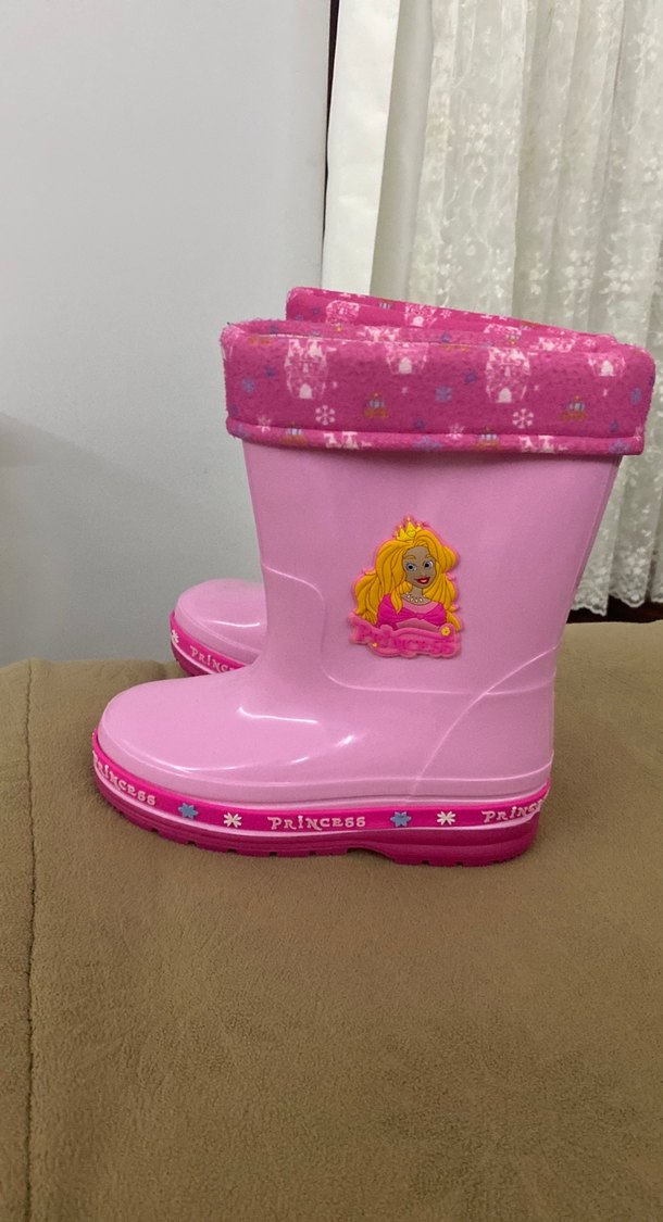 Pembe renkli, baskılı ve Velcro bantlı kız çocuk kauçuk çizmesi. Altında "PRINCESS" yazısı ve prenses figürü bulunur. Sokak stili için uygun.Sıfır hiç giyilmemiştir. 34 numara