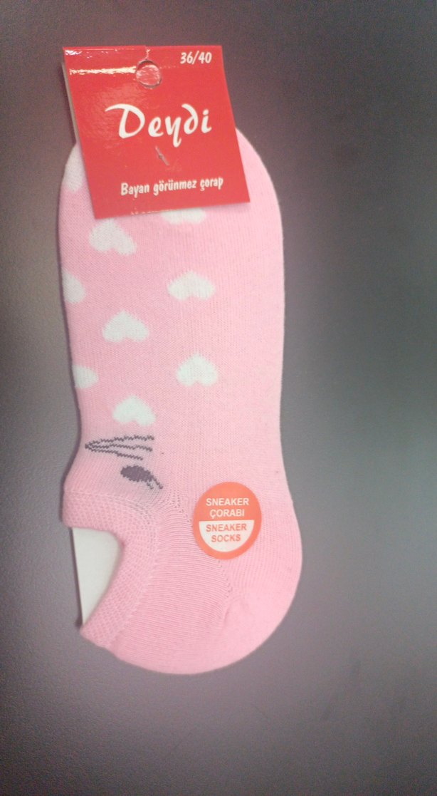 Yumuşak ve sıcak pembe kız çorabı, beyaz kalp desenli. Deydi markasına ait sneaker tarzı alçak kesim çorap.