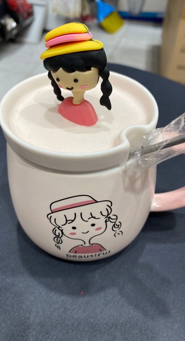Pastel pembe seramik kupa, üzerinde kız figürü ve 'beautiful' yazısı bulunur. Üstünde kız figürlü kapak vardır. ☕