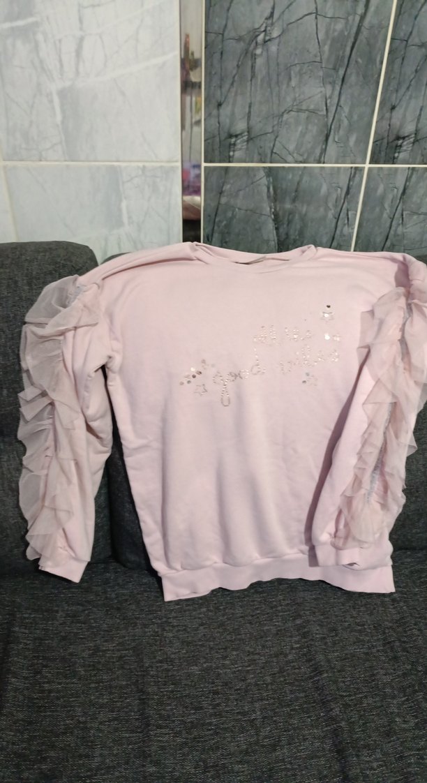 Pembe renkli kız sweatshirtü, uzun kollu ve fırfırlı kol detayına sahiptir. Rahat kesimi ve baskılı deseniyle gündelik şıklık sunar.