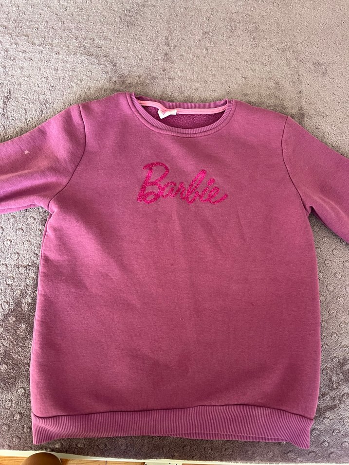 Yumuşak fleece kumaştan, uzun kollu, bol kesim pembe sweatshirt. Yakası yuvarlak, önünde triko ve parlak baskılı 'Barbie yazısı bulunur. Trend sokak giyimi için uygun.