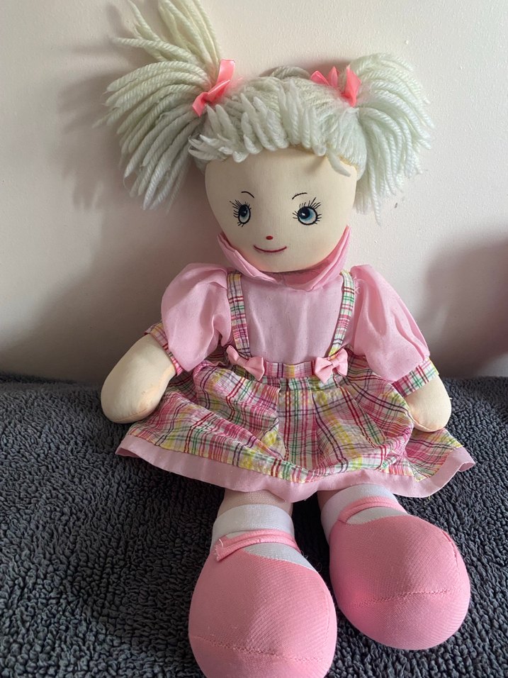 Yumuşak ipten saçlı, pembe pastel renkli bebek. Ekoseli elbise ve uyumlu ayakkabılarla tamamlanmış, sevimli oyuncak.