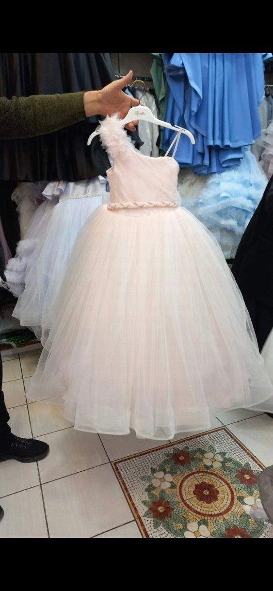 Hafif pembe renkte, drapeli ve tek omuz askılı klasik kız çocuk elbisesi. Fit kesimli, straplez yaka ve modern klasik tarzda, yumuşak sentetik kumaş. 6 - 7 yaş için uygundur. Birkaç saat giyindi. Tertemiz miss gibi duruyor.