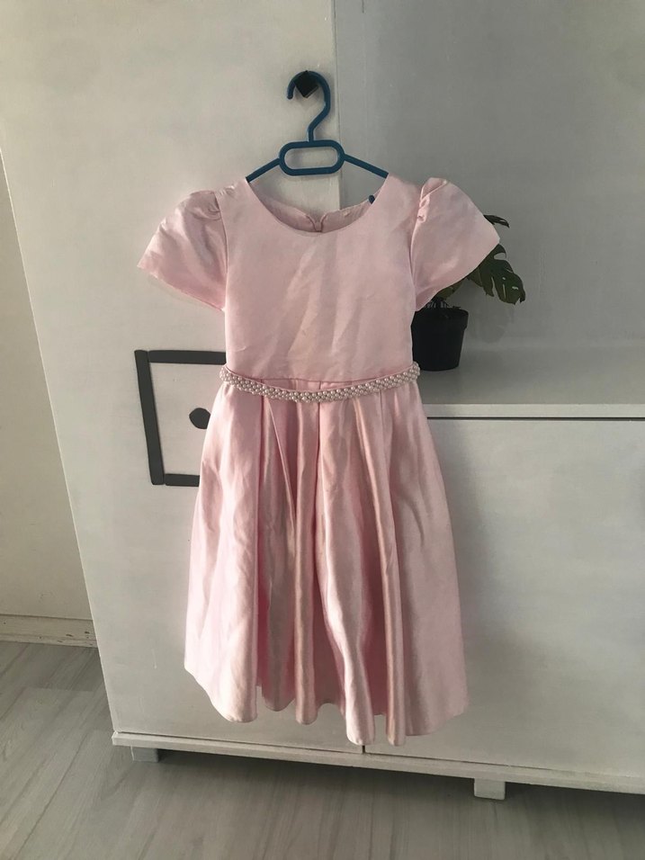 Pembe pastel renkte, kısa kollu, piliseli etekli ve yuvarlak yakalı, bol kesim kız elbisesi. İpeksi kumaşla klasik bir şıklık sunar.