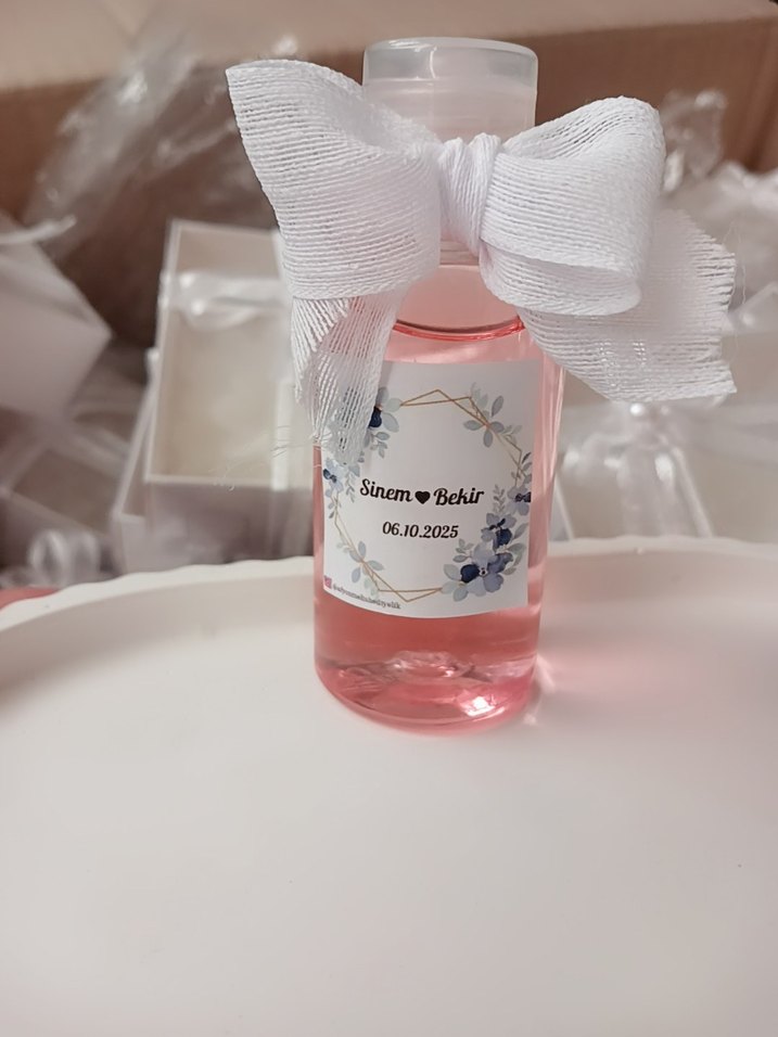 Beyaz fiyonk ve isimli tarihli çiçekli etiketli pastel pembe hediye şişesi, özel günler için uygun. dagitmalik kolanya şişesimiz