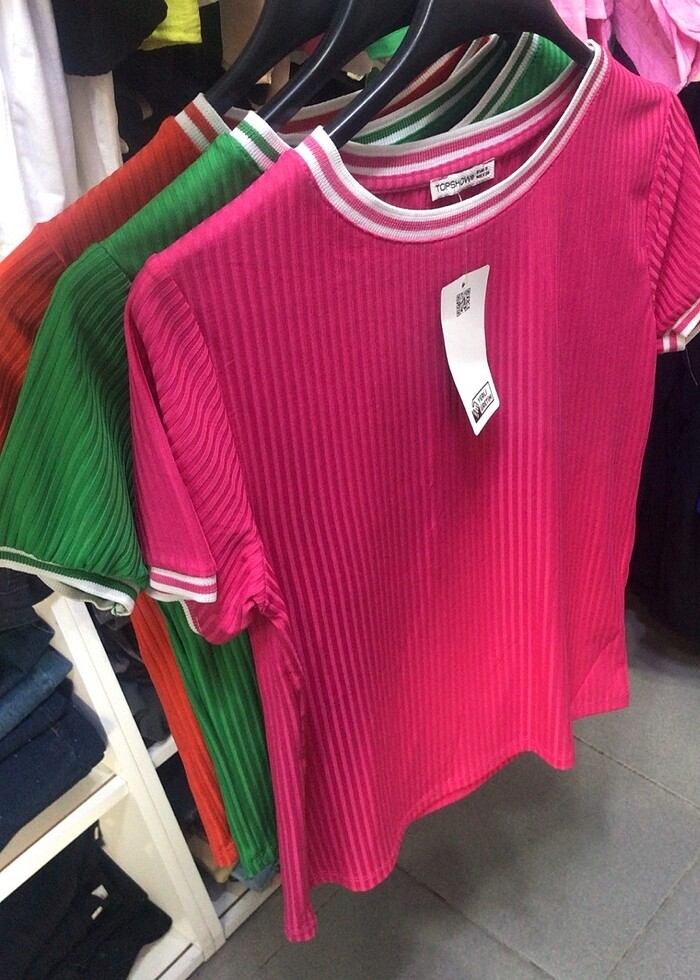 Pembe kolları ve yakası çizgili tişört