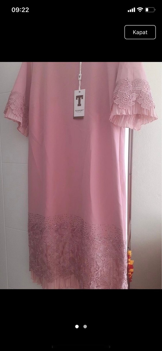 Pembe renkli uzun abiye elbise, kısa volanlı kollara ve yuvarlak yaka tasarımına sahiptir. Etek ve kol uçlarında zarif çiçek dantel detayları bulunur, düğünler davetler için uygundur. 50-52-56 bedenleri mevcut.