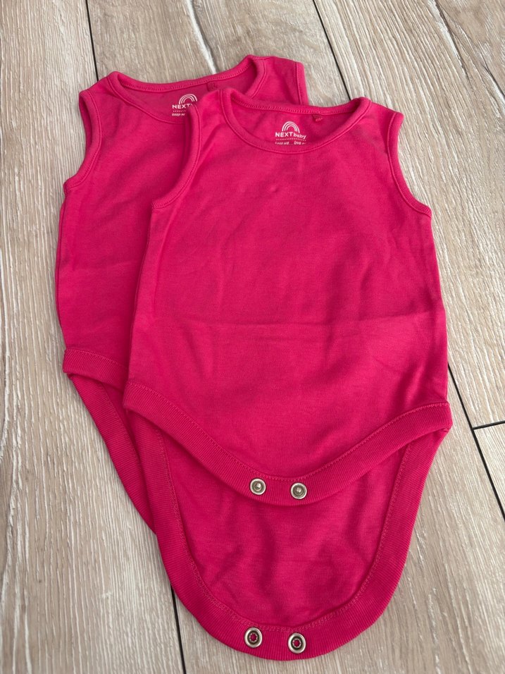 Canlı pembe renkli, kolsuz, yuvarlak yakalı, düğmeli 2'li bebek body seti. Rahat ve kullanışlı tasarım. Hiç kullanılmadı.